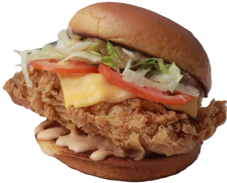 Crispy chicken piece with a restaurant sauce. & dynamite sauce and brioche bun topped with a slice of American cheese, onions and lettuce